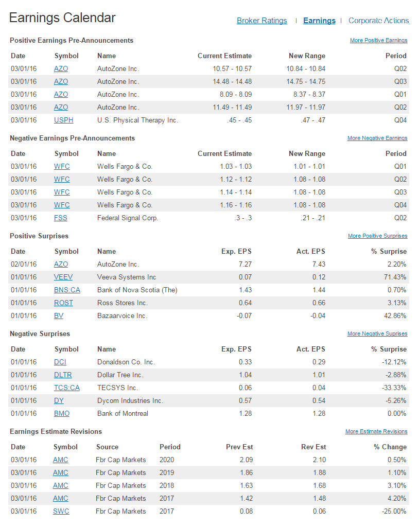 QuoteMedia's Earnings Market Summary is an embeddable market data widget that supplies the most recent Earnings updates for all North American Exchanges. This tool can be a very valuable addition to any site or service, as it provides actionable information that can significantly affect stock prices, including: Positive and Negative Pre-Announcements, Positive and Negative Surprises and Earnings Estimate Revisions.