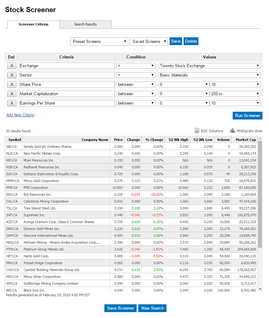 With QuoteMedia's Stock Screener, your users and Site visitors can easily match their trade ideas with potential investments. The Stock Screener can be used to filter stocks based on the criteria you specify, to weed out those companies that don’t meet your requirements, and to provide a list of securities that meet the profile you want to focus on.